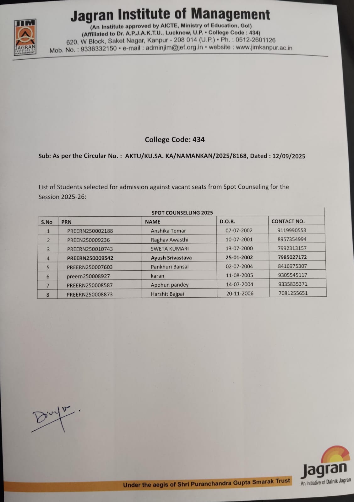 My two-year MBA journey (2020–2022) at Jagran Institute of Management (JIM), Kanpur, was truly transformative—offering a balanced blend of industry-aligned curriculum, practical exposure through case studies, workshops, and live projects, all of which honed my analytical and decision-making skills. The dedicated faculty not only taught but mentored us with personalized support, while JIM’s strong placement cell ensured valuable internships and placement opportunities, including regular mock interviews and corporate exposure that eased my transition into the professional world